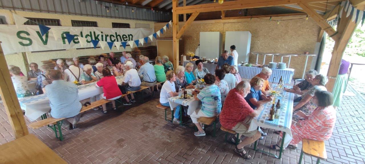 Groß war die Enttäuschung der Feldkirchener Senioren als sie von der Absage des Festes in Niedermotzing zur Volksfestzeit hörten. War es doch schon eine schöne Tradition geworden sich dort mit der Seniorenrunde zu treffen. Doch die Verantwortlichen um Paula Arnold griffen kurzentschlossen einen Vorschlag aus dem Kreis der Senioren auf und organisierten eine Grillfeier auf dem Sportgelände in Feldkirchen. Im stilecht weißblau dekorierten Anbau des Sportheims wurden über 40 Gäste mit Steaks, Bratwürsten und einem reichhaltigen Salatbuffet bewirtet. Auch für leckere Kuchen war durch eine Spende aus den Reihen der Gäste gesorgt. Richtige Volksfeststimmung kam auf, als jeder mit einem Volksfestherz überrascht wurde.