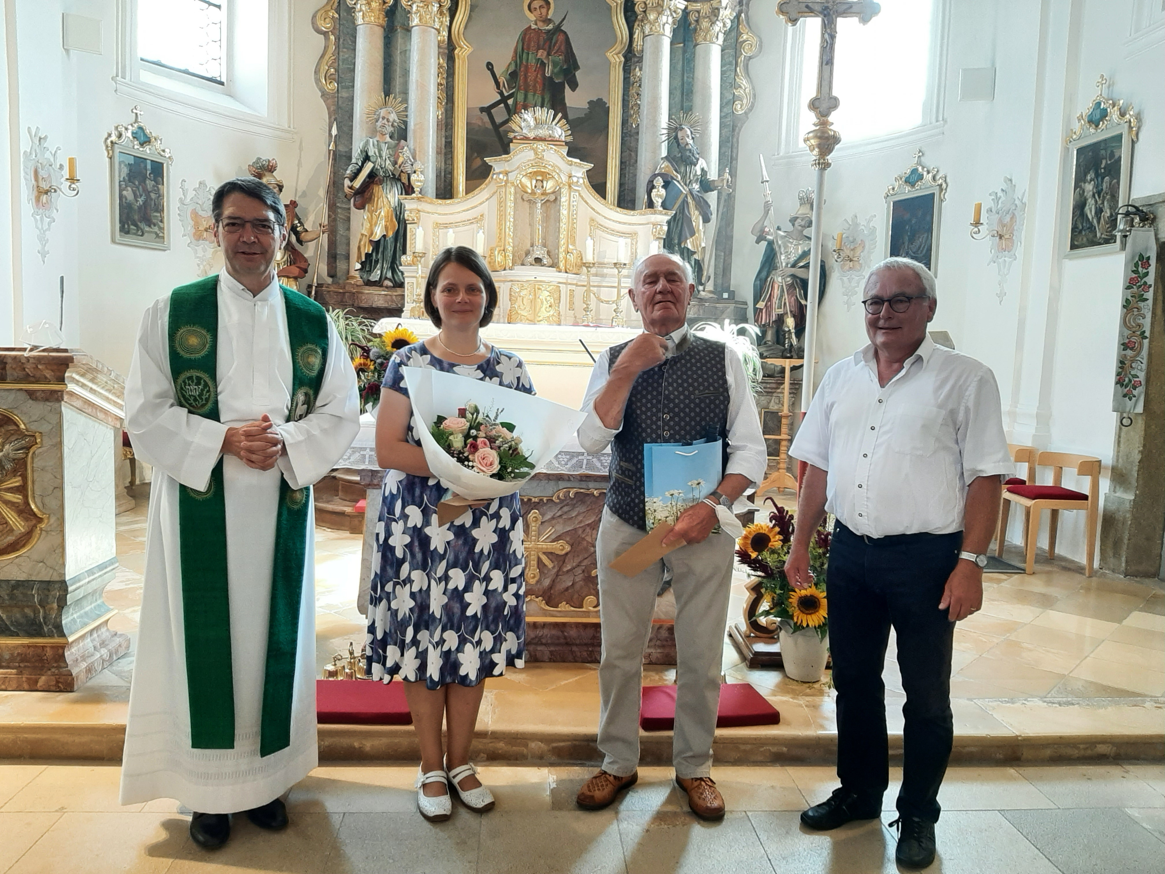 Am letzten Sonntag wurden nach der feierlich mit dem Kirchenchor gestalteten Eucharistiefeier zwei Mesner von Pfarrer Dieter Zinecker verabschiedet. Frau Erika Biro, die seit 2016 als Mesnerin in Feldkirchen tätig war, ist aufgrund des Wegzugs aus der Pfarrgemeinde nicht mehr in der Lage, den Mesnerdienst auszuüben. Pfarrer Zinecker bezeichnete Frau Biro für die Gemeinde als Glücksfall – weil sie die Tätigkeit nicht nur stets umsichtig ausgeführt hat, sondern es ihr ein inneres Bedürfnis war, ihren wichtigen Anteil zur Feier der Sakramente in der Pfarrei zu leisten. Sie habe diese Tätigkeit sechs Jahre mit einer vorbildlichen inneren Einstellung und von ganzem Herzen ausgeführt. Dafür bedankte sich Pfarrer Zinecker im Namen der Kirchenverwaltung, des Ortsausschusses und der gesamten Pfarrgemeinde herzlich. Er überreichte Frau Biro einen Blumenstrauß und ein Abschiedsgeschenk.