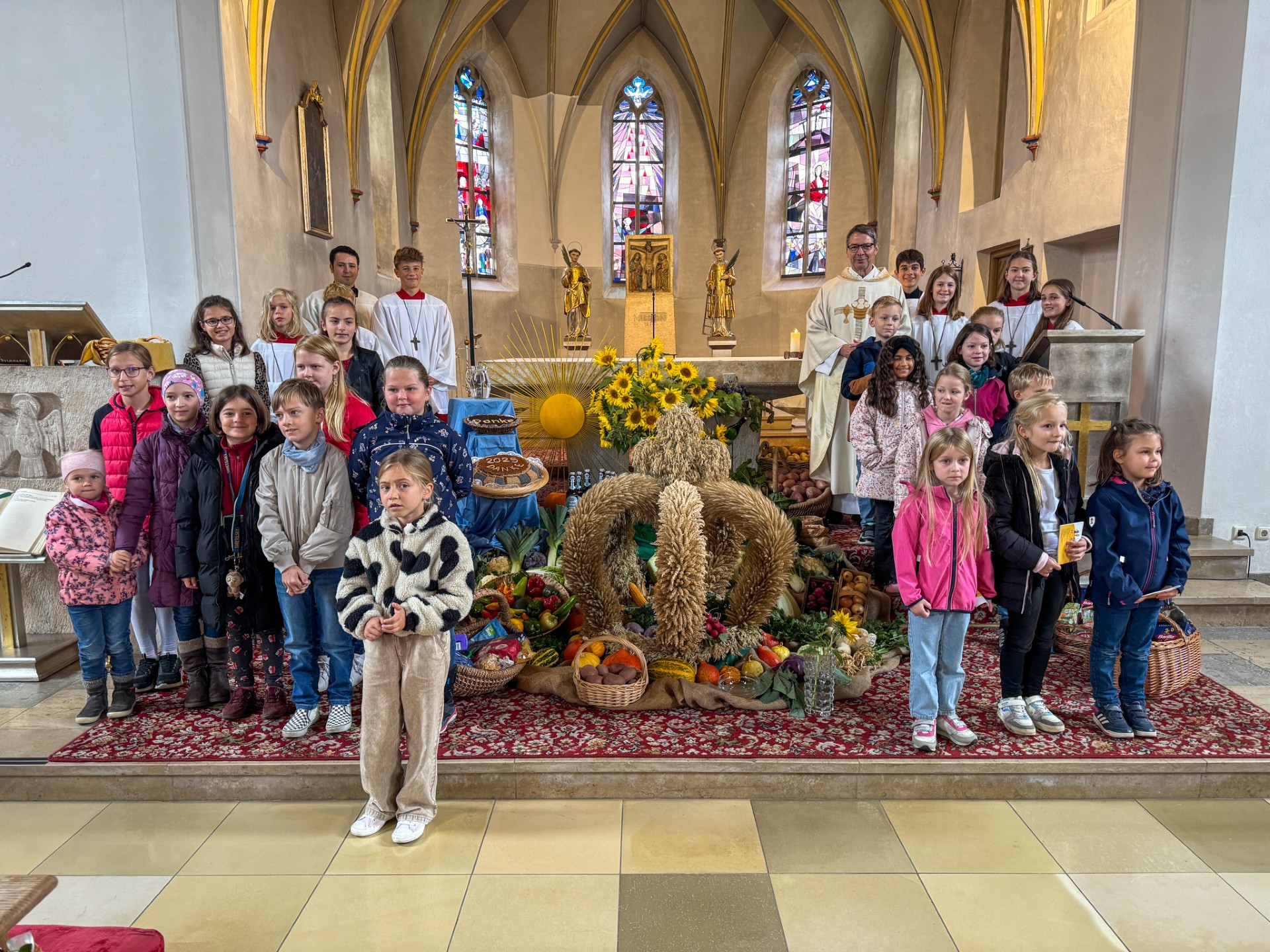 Bild: Der Erntealtar, die Ministranten und die Kinder, die Texte vorgetragen haben oder bei den Stephani-Spatzen singen, mit Pfr. Dieter Zinecker.