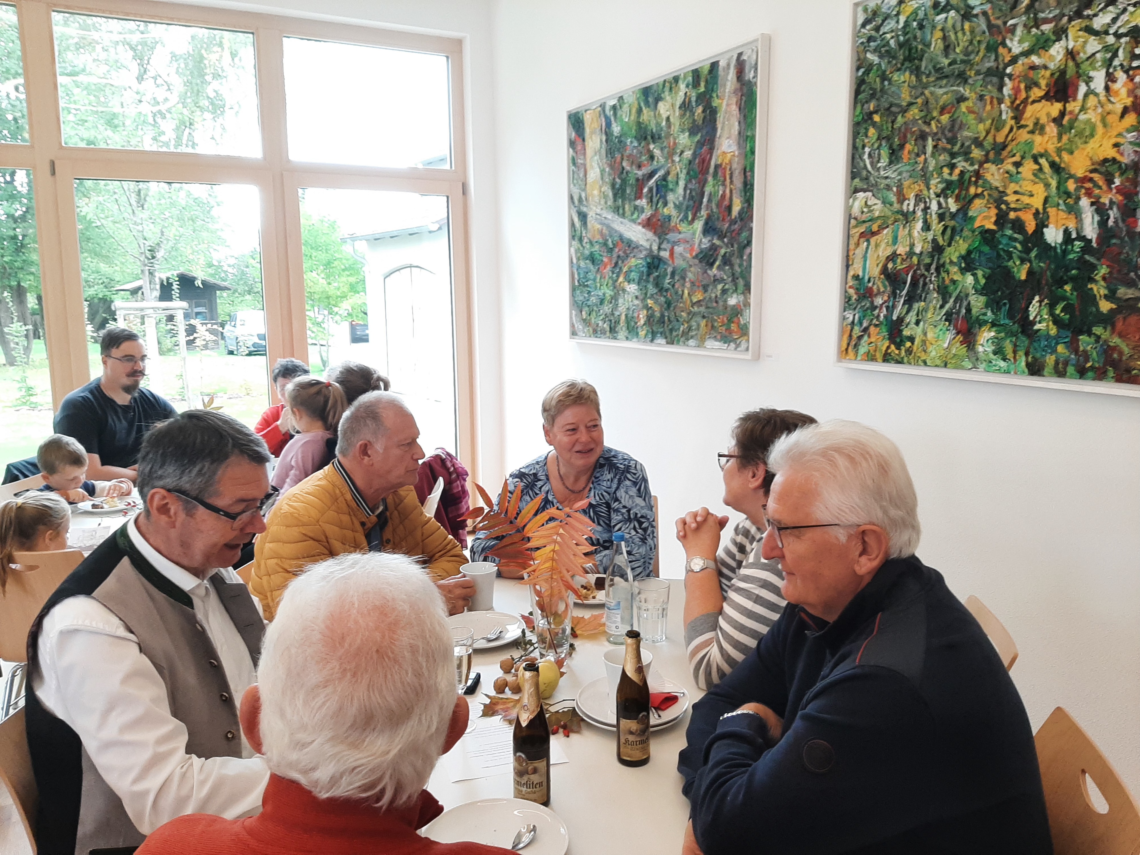 Nach dem feierlichen Erntedankgottesdienst in der Pfarrkirche wurden die Gläubigen in diesem Jahr zum ersten Mal zu einem Kirchencafè im neuen Pfarrsaal eingeladen. Der Pfarrgemeinderat hatte den Saal herbstlich geschmückt und Kaffee und Kuchen, Getränke und Häppchen waren vorbereitet. Pfarrer Dieter Zinecker und Ortsausschusssprecherin Rosemarie Murr-Anzenberger freuten sich in ihrer Begrüßung über „volles Haus“. Ein wunderbar gemischtes Publikum hatte sich im Pfarrsaal eingefunden und feierte nun auch im weltlichen Rahmen Erntedank. Das Ziel des 1. „Kirchencafès“ – das neue Pfarrheim mit Leben und gelebter Gemeinschaft zu erfüllen – wurde aus Sicht der Organisatorinnen und der Besucher wunderbar erreicht. Diese Aktion wird mit Sicherheit wiederholt werden!