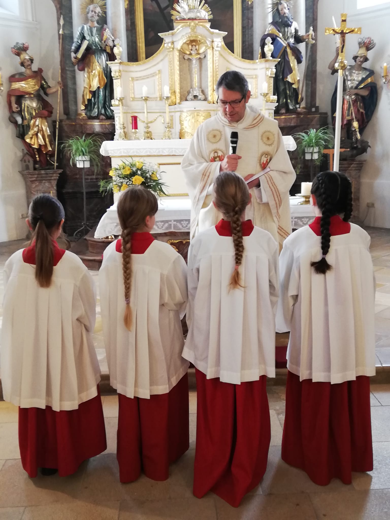 Der Festgottesdienst am Kirchweih-Sonntag, 19. Oktober, stand in der Pfarrei St. Laurentius in Feldkirchen ganz im Zeichen der Ministranten. Zahlreiche Gemeindemitglieder – darunter viele Erstkommunionkinder – füllten die Pfarrkirche und schufen so einen feierlichen Rahmen für den Gottesdienst, den Organist Simon Bründl musikalisch in gewohnter Weise gestaltete. Nach einem feierlichen Einzug wurde die Feier durch Pfr. Dieter Zinecker liturgisch eröffnet. In seiner Predigt griff Pfr. Zinecker zu Beginn einen Traum des heiligen Franz von Assisi auf. Nach einem Besuch der kleinen Kirche San Damiano bei Assisi träumte Franziskus, Christus spreche zu ihm und fordere ihn auf, seine Kirche wieder aufzubauen. Zinecker verwies dabei auf ein berühmtes Gemälde, auf dem der Heilige als Stützpfeiler der Kirche fungiert. Für die neuen Ministrantinnen und alle Gemeindemitglieder hatte der Geistliche noch einen Rat mit dabei: sie sollen „lebendige Steine“ für die Kirche, die Gemeinde vor Ort sein, welche nicht nur aus dem Kirchengebäude, sondern eben aus der Gemeinschaft miteinander bestehe. Damit bezog sich Pfr. Zinecker auf die Lesung aus dem 1. Petrusbrief. Zur Aufnahme der vier neuen Ministrantinnen, die sich an die Predigt anschloss, rief Oberministrantin Johanna Nißl diese namentlich auf: Marlena Ketterl, Leonie Unger, Magdalena Manger und Anna Schimpfhauser. Vor dem Altar erklärten sie laut und deutlich ihre Bereitschaft zum Ministrantendienst. Im Anschluss an die Segnung der neuen Ministrantenplaketten überreichte Pfr. Zinecker diese den vier jungen Mädchen mit den Worten: „Sei eine Zeugin des Evangeliums und eine Freundin Jesu.“ Danach bekannte die ganze versammelte Kirchengemeinde gemeinsam ihren Glauben und feierte eine festliche Eucharistiefeier, bei der die vier Neuen gleich ihren Dienst für Gott und die Gemeine übernahmen. Den feierlichen Schlusspunkt dieses Kirchweih-Gottesdienstes bildete – dem Anlass entsprechend – das Te Deum: Großer Gott, wir loben dich!