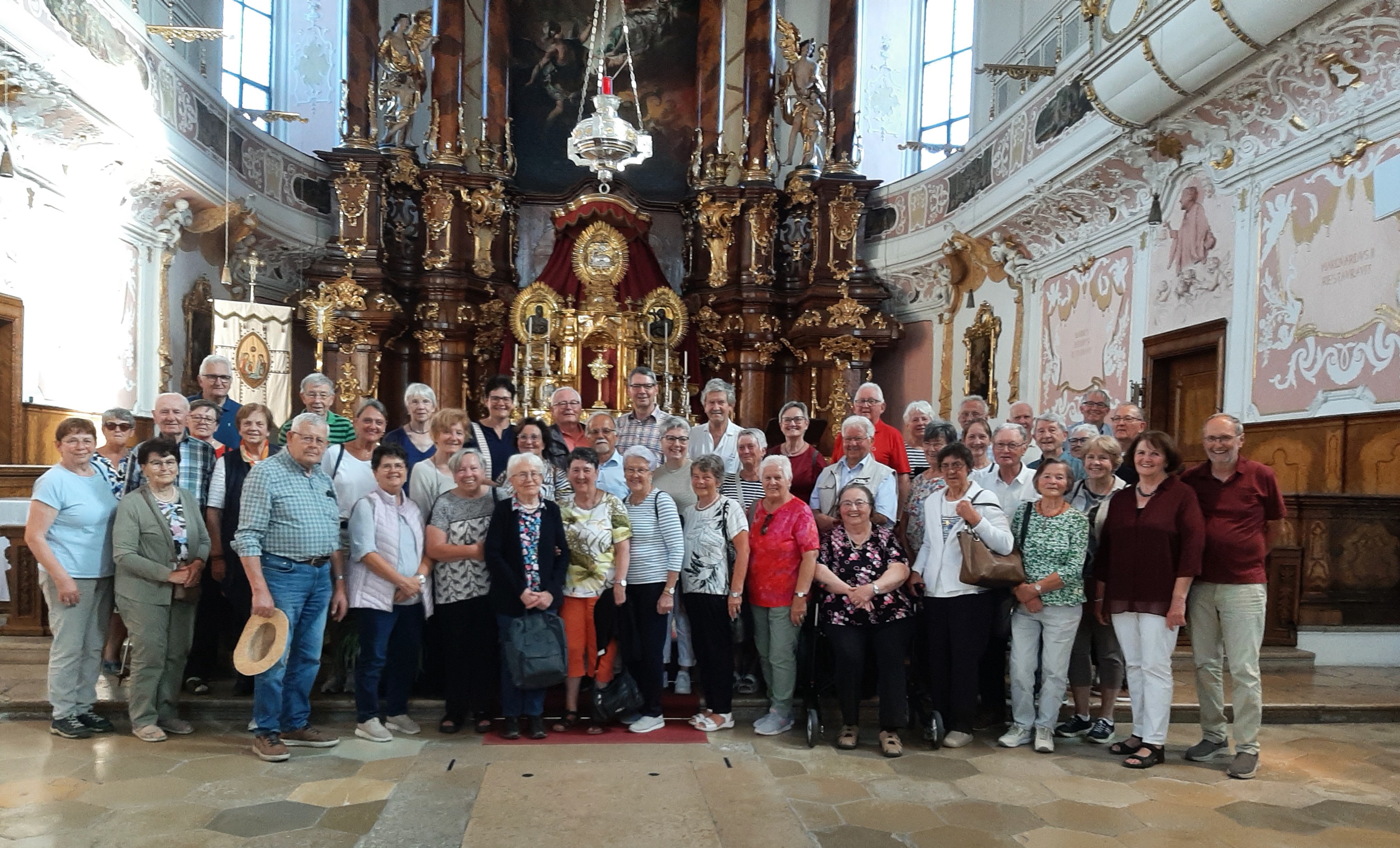 Der Pfarrausflug der Pfarreiengemeinschaft führte am 20. September in die Bischofsstadt Eichstätt. Der Sommer kehrte am Ausflugstag noch einmal mit strahlend blauem Himmel zurück, als sich die Reisegruppe im fast ausgebuchten Bus auf den Weg machte. Mit einer gemeinsamen kurzen Andacht und Gesang sowie dem Reisesegen durch Pfarrer Dieter Zinecker startete die Pfarrfamilie in den Tag. In Eichstätt angekommen erwarteten schon zwei Touristenführerinnen die Gruppe und führten mit interessanten Informationen durch die barocke Altstadt an der Altmühl. Höhepunkt der Führungen war zweifellos der monumentale Dom der Stadt mit der beeindruckenden Statue des Hl. Willibald, dem Pappenheimer Altar aus dem Jahr 1489 und dem wunderbaren Kreuzgang. Im Anschluss an die Führungen konnte man sich noch an der Samstagsmatinèe - einem kurzen Orgelkonzert im Dom – erfreuen. Nach soviel Kultur war nun das Mittagessen im Gasthof Krone auf dem Programm. Nach gutem Essen und angeregten Gesprächen ging es gestärkt in den Nachmittag. Das Organisationsteam Wagner/Murr-Anzenberger hatten mehrere Möglichkeiten im “Angebot“: Ein Teil der Mitfahrer machte sich auf den Weg zur Willibaldsburg. Hier konnte man neben dem wunderbaren Blick auf die Altstadt auch den sehenswerten Bastionsgarten bestaunen. Auch der Hofgarten der Sommerresidenz und die ehemalige Klosterkirche Notre Dame du Sacrè Coer – eines der bedeutendsten Barockbauwerke Eichstätts - wurden von einer Gruppe besucht. Bei einer ausgiebigen Kaffeepause konnte man sich von den hochsommerlichen Temperaturen erholen und alle Teilnehmer trafen sich zum Abschluss für eine gemeinsame Andacht in der prächtigen Schutzengelkirche. Von außen macht sie eher einen strengen Eindruck, wer sie betritt wird aber von einer besonderen Atmosphäre empfangen: 567 Engelsdarstellungen schmücken die Kirche. Nach der gemeinsamen Andacht ganz unter dem Motto des Hl. Jahres „Pilger der Hoffnung“ machte sich die Gruppe wieder auf den Heimweg. „Nach dem Ausflug ist vor dem Ausflug“ – schon auf dem Rückweg zum Bus wurden Vorschläge für ein Ziel im nächsten Jahr erörtert!